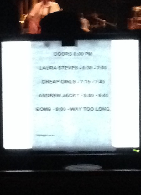 Finally, it was time for Bomb to take the stage. My friends headed toward the front of the crowd, and I took this picture of the stage times for each band at the tech booth.