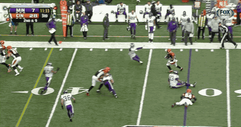 What’s even more impressive is Bernard’s intelligence on this play against the Vikings. Not only does he make a spin move straight out of your wildest fantasies, but after breaking free, he slows down around the 25-yard line to wait for his blockers. Then, with the additional help from his teammates, he’s able to bring the ball inside the 10-yard line. Bernard isn’t just a human highlight reel. He has the awareness to cut back and use his blocking to get every yard he can out of every play.
