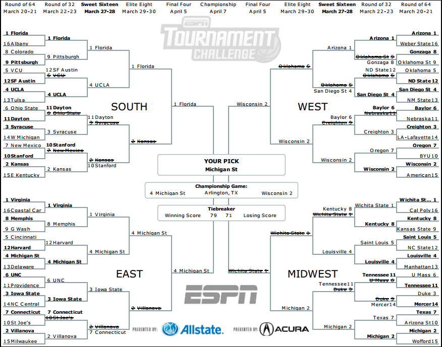 This bracket somehow predicted Stanford and Baylor reaching the Sweet 16. Michigan State and Louisville are still alive. Wichita State is dead. The dream is dead. All hope is dead. But this bracket just won’t die.