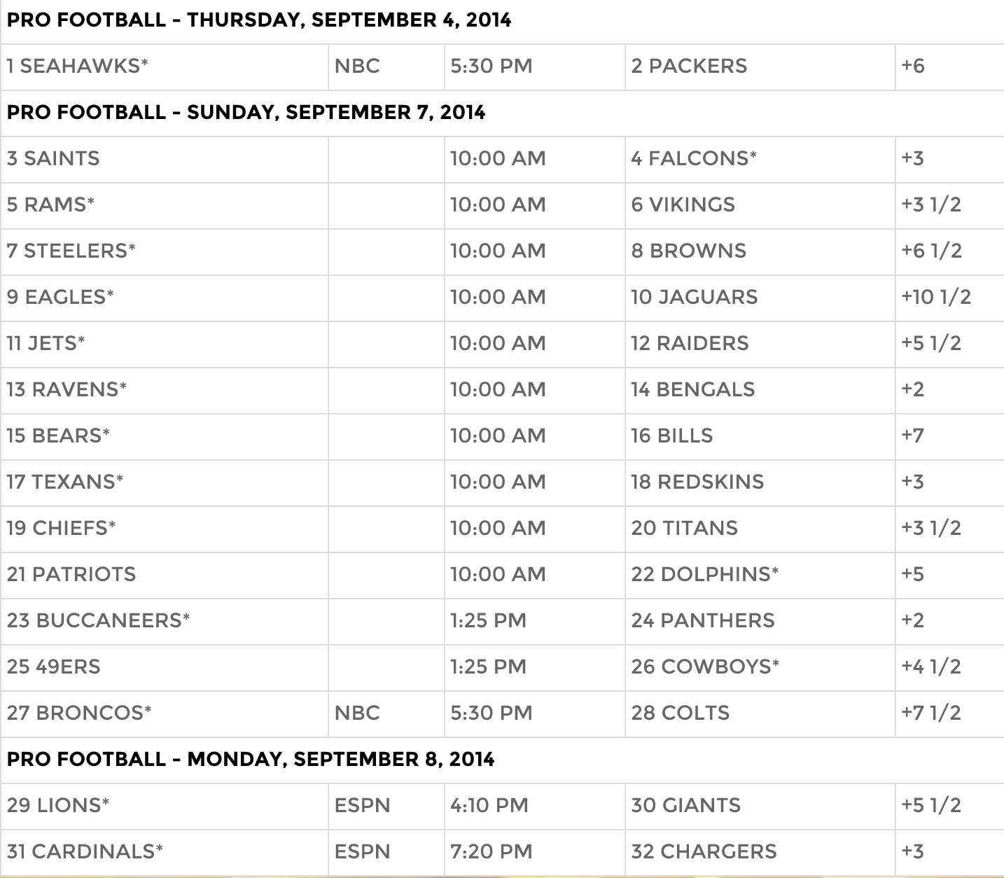 Word. The time for questions is over. Let’s get hypothetical for the first time of the season. Here is the table for the opening week of the NFL season. Home team gets the asterisk. Oh how I missed you gambling.