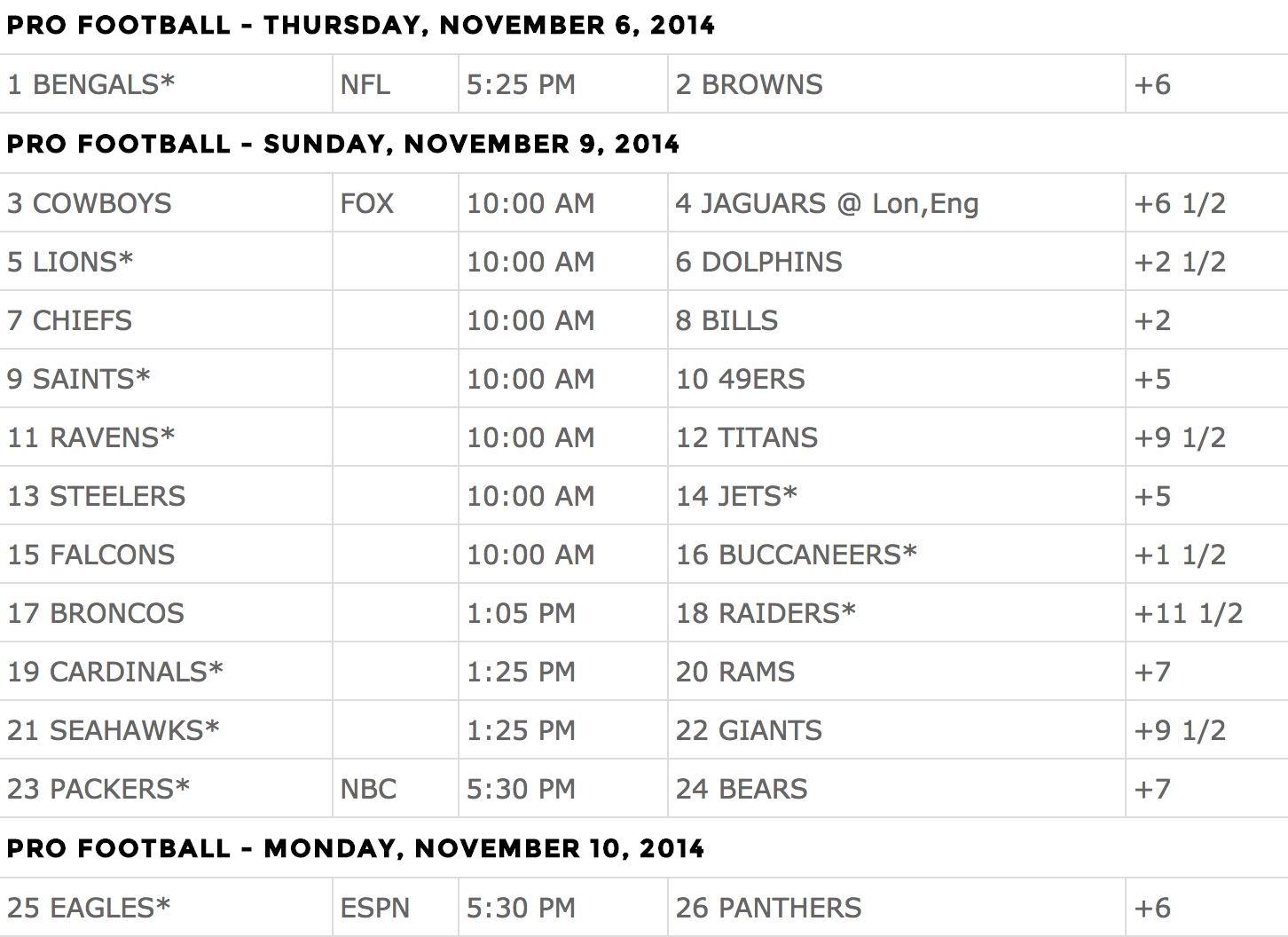 Here’s the Week 10 slate. Home teams get the asterisk.
