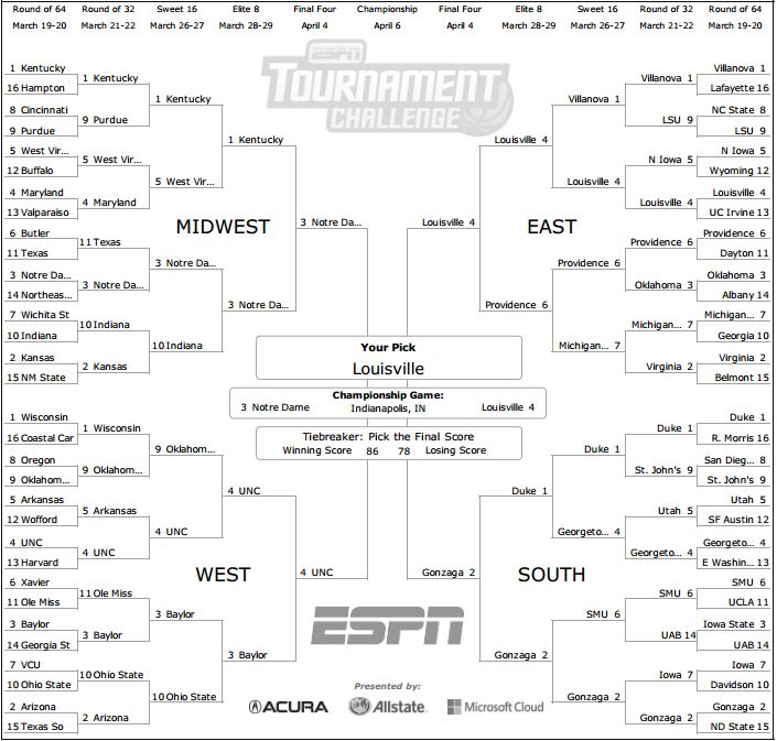 CHAMPIONSHIP: Louisville over ND by 8 points, just because. Louisville is my favorite. I didn’t even care about any of this when I started writing, but now I’m all in on Louisville. Love Louisville. I will be so disappointed if they get knocked out early. Don’t know about the score though. Is that how many points usually get scored in college basketball? Honestly, I have no idea. It looks good to me though, so I’m booking it.