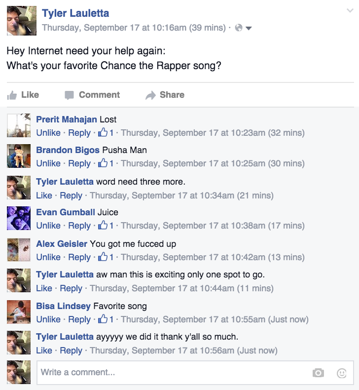 Although I cut us off at five, I want to report that this post eventually got to 11 different songs referenced as someone’s top Chance track without a repeat, which I feel is rather impressive.
