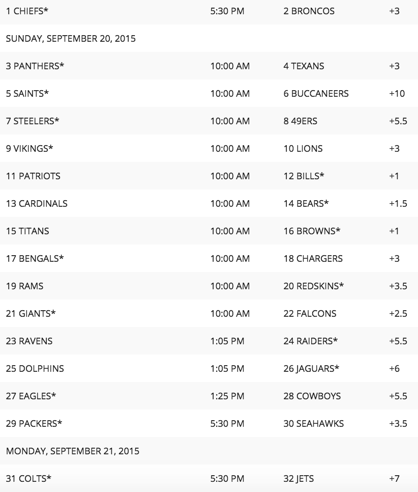 And so this week I have attempted to rededicate myself to the act of writing this gambling column. I have been out of the writing game for a bit, but this has always been my favorite thing to write: if there is any act of writing I want to commit myself fully to, it better be the Hypothetical SuperContest. With that in mind, let’s now watch as my picks once again take off with promise and see if this dingus embarrasses himself again. Here’s your Week 2 lines. Home team gets the asterisk.