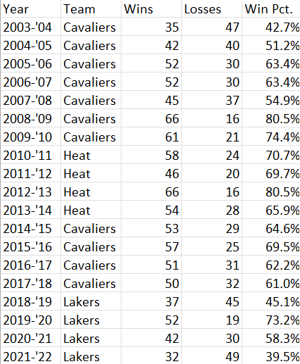 Even if the Lakers close out their season with a win against the Nuggets Sunday night – not an ideal situation by any means – this will be the worst team featuring LeBron James in his career. It has been an atypical past couple of years for a variety of reasons, but LeBron’s roster construction habits – or input, or whatever you want to call it – since the Cavs won the title in 2016 haven’t inspired much confidence as he has aged, with the exception of going after Anthony Davis, which any team with a shot would’ve done anyway.