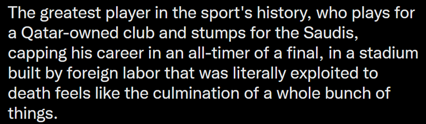 This is where we get uncomfortable: the extra twenty seconds or so that the world had to wait in order for some official or another to explain to Lionel Messi, maybe in real time the world’s most singularly beloved living figure, how to put on ceremonial dress were a painful reminder that, for all of the pomp surrounding an ostensible furthering of the world’s sport toward new horizons, it’s also all just a blanket money grab, at the cost of many thousands of human lives. Messi’s direct involvement in Saudi Arabia’s current bid for the 2030 World Cup[6] is another reminder of that.